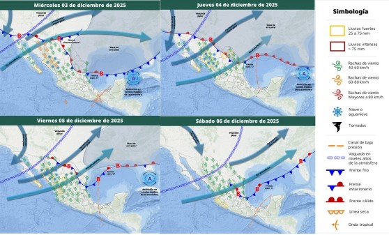 Además, un nuevo frente frío se aproximará sobre la frontera norte durante el día cuatro de diciembre, ocasionando un marcado descenso de temperaturas, lluvias de ligeras a moderadas, rachas de viento fuertes y probabilidad de caída de nieve y aguanieve sobre la región montañosa.